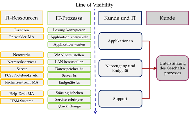 Für den Kunden entsteht ein IT-Service als Kombination aus Sachgütern (Hardware und Infrastruktur), Rechten (Applikationen etc.) und Dienstleistungen (Beratung, Schulung, Support etc.). Die IT-Prozesse und Leistungen sind aus Sicht des Kunden wie ein Eisberg – nur ein kleiner Teil ist sichtbar. Dieser für den Kunden sichtbare Teil ist für ihn relevant. Im Service Engineering wird empfohlen, die Prozesse als Blueprints darzustellen, in denen die „Line of Visibility“ eingetragen werden. Der Kunde nutzt in seinem Geschäftsprozess die für ihn sichtbaren Leistungen der IT, die in der Kombination wertsteigernd sind. Es ist nicht sinnvoll, drei Service Level Ag-reements zu vereinbaren und abzurechnen. Der Kunde dürfte meist an einem „All inclusive“ Paket interessiert sein, da ihm die Kompetenz fehlt, die einzelnen Teilleistungen so zu kombinieren, dass sein Prozess optimal unterstützt wird.